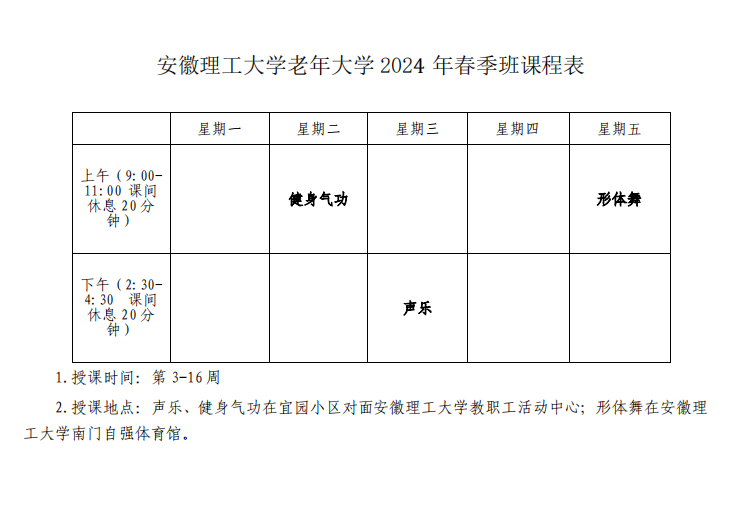 1.声乐、健身气功:宜园小区对面安徽理工大学教职工活动中心一楼多功能厅。