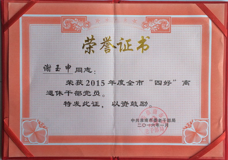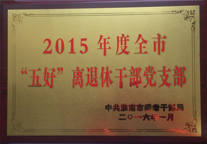 3 月1日 上午,淮南市组织部长会议暨基层党建和老干部会议在淮南市老年大学会议厅隆重举行。大会表彰了2015年度在争创“五好”离退休党支部、“四好”离退休干部党员活动中取得优异成绩的17家“五好”离退休干部党支部和20名“四好”离退休干部党员。根据《关于表彰2015年度全市“五好”离退休干部党支部、“四好”离退休干部党员的决定》,我校北区离退休直属党支部荣获“全市‘五好’离退休干部党支部”荣誉称号,离休党员谢玉申同志荣获“全市‘四好’离退休干部党员”荣誉称号。
