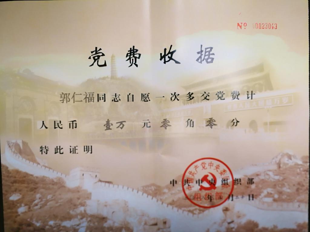 近日,收到中共中央组织部开出的郭仁福同志自愿一次多交壹万元党费收据。郭仁福用缴纳“特殊党费”的方式践行入党誓词,他爱党、护党、忧党、拥党,以实际行动诠释着“永远跟党走”的坚定告白。