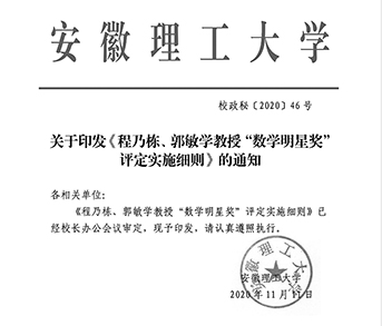 2020年11月,“数学明星奖”在安徽理工大学设立。该奖项每学年评选名额一名,奖金为一万元,是安徽理工大学由个人出资、金额最高的单项奖学金,用于奖励在数学科目研究和学习优异、潜质优秀的学生。